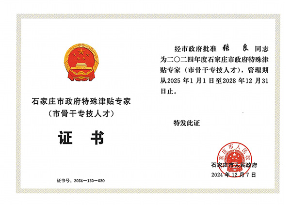 經公司組織申報,石家莊市鹿泉區(qū)人民政府推薦、石家莊市人力資源和社會保障局組織評審,石家莊市人民政府批準,我公司張良同志榮獲石家莊市政府特殊津貼專家(市骨干專技人才)稱號。