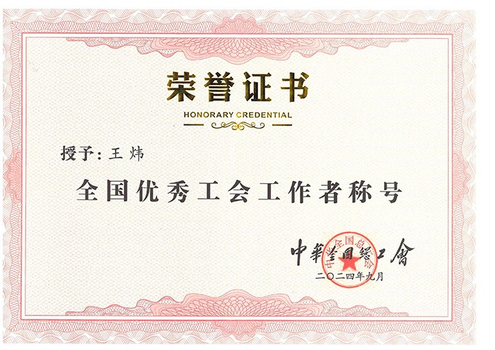 王煒同志榮獲中華全國(guó)總工會(huì)“全國(guó)優(yōu)秀工會(huì)工作者”榮譽(yù)稱號(hào)
