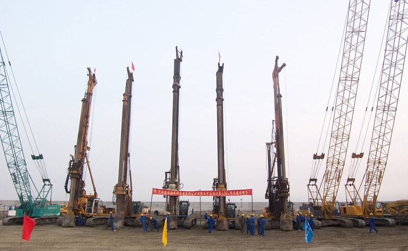 我公司完成三岔雙向擠擴旋挖鉆孔灌注樁,樁徑1.4m,每根樁三個盤徑2.4m的承力盤,混凝土等級C40,共720根樁,并完成了樁端后壓漿、鑿樁頭及地面接樁工作,共計70695m³混凝土;振動沉管碎石樁4416根;碎石墊層25794 m3;混凝土地坪施工12766m2。
