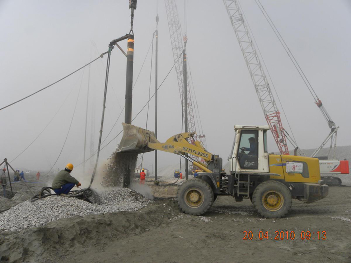 儲罐振沖碎石樁工作量:碎石樁每罐基礎(chǔ)1519根,共6076根,樁徑1300㎜/1200㎜,樁長30m,總方量318512m3。