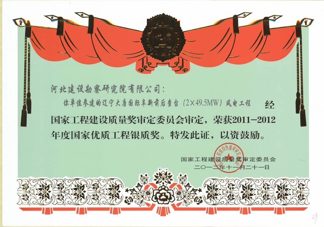 由我公司參與施工的遼寧大唐國際阜新前后查臺(2×49.5MW)風(fēng)電工程被國家工程建設(shè)質(zhì)量獎評定委員會評定為2011-2012年度“國家優(yōu)質(zhì)工程銀質(zhì)獎”。