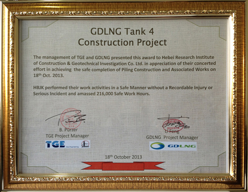 廣東大鵬LNG工程自2013年4月18日開工,至2013年9月4日完成樁基施工,10月份完成包括鑿樁頭在內的所有現(xiàn)場施工任務。在此期間,項目部全體成員一直堅持安全第一的理念,嚴格按照總包、業(yè)主的安全文明施工要求穩(wěn)步推進工作,得到了總包、監(jiān)理、業(yè)主的一致好評,工程結束后總包TGE為我公司頒發(fā)了安全文明施工獎狀。