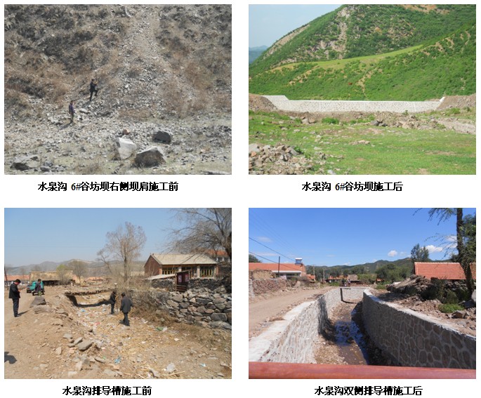 本治理工程施工時(shí)間為2013年5月8日-2013年9月10日,包括水泉村范圍內(nèi)水泉溝、王小溝兩條溝谷,主要施工項(xiàng)目為谷坊壩、排導(dǎo)槽、擋墻工程,其中水泉溝內(nèi)包括6道谷坊壩,PM2坡面護(hù)腳擋墻,水泉溝單側(cè)排導(dǎo)槽(0~249.3m),水泉溝雙側(cè)排導(dǎo)槽(0~708.6m),王小溝內(nèi)包括道谷坊壩7道,王小溝單側(cè)排導(dǎo)槽(0~271.2m),王小溝雙側(cè)排導(dǎo)槽(0~372m)。